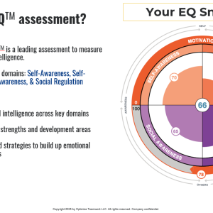 The two confidential, 1:1 Sessions are led by a Certified Emotional Quotient Coach who will help the participant understand the key traits and behaviors of Emotional Intelligence and how to apply their personalized results to build up their interpersonal and intrapersonal skills.